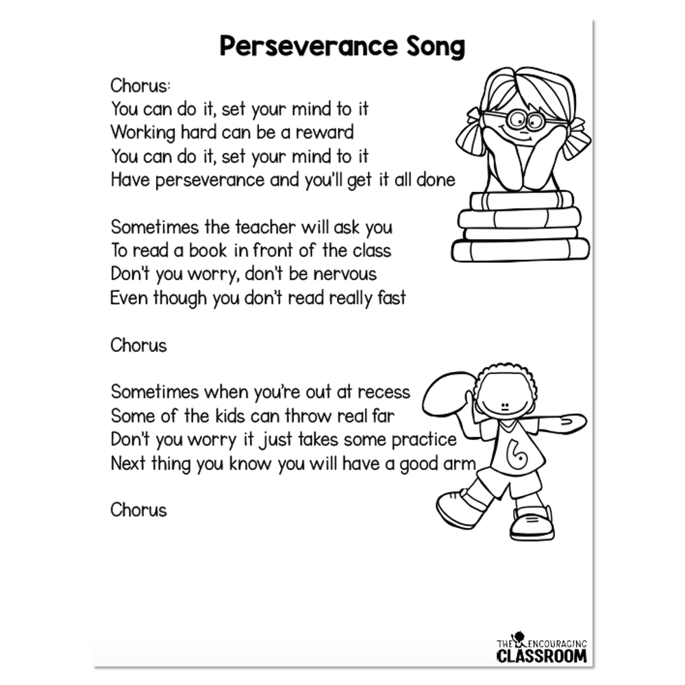 The lyrics to the Perseverance Song. This is part of the Social Emotional Learning curriculum. This curriculum is flexible, no prep, and easy to implement.