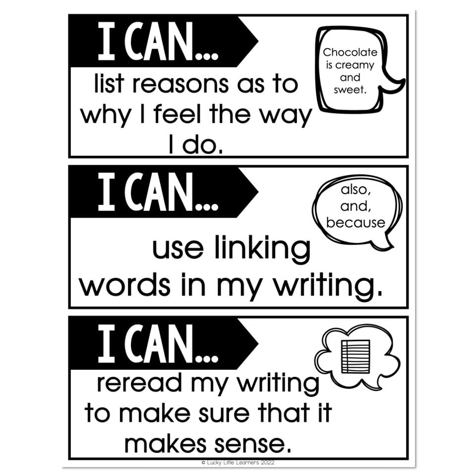 Writing “I Can” statements focusing on listing reasons, using linking words and proofreading writing.