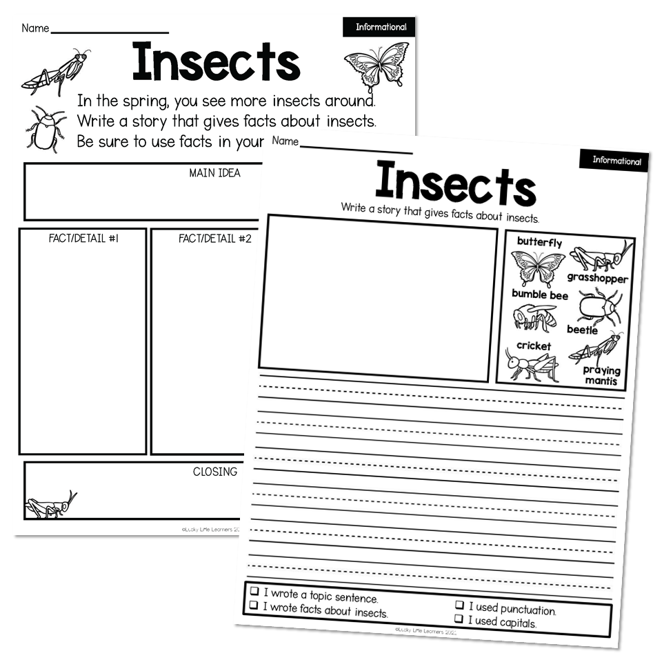 A 1st grade no prep informational writing page about insects that includes a graphic organizer, handwriting paper, a word list, and an editing checklist.
