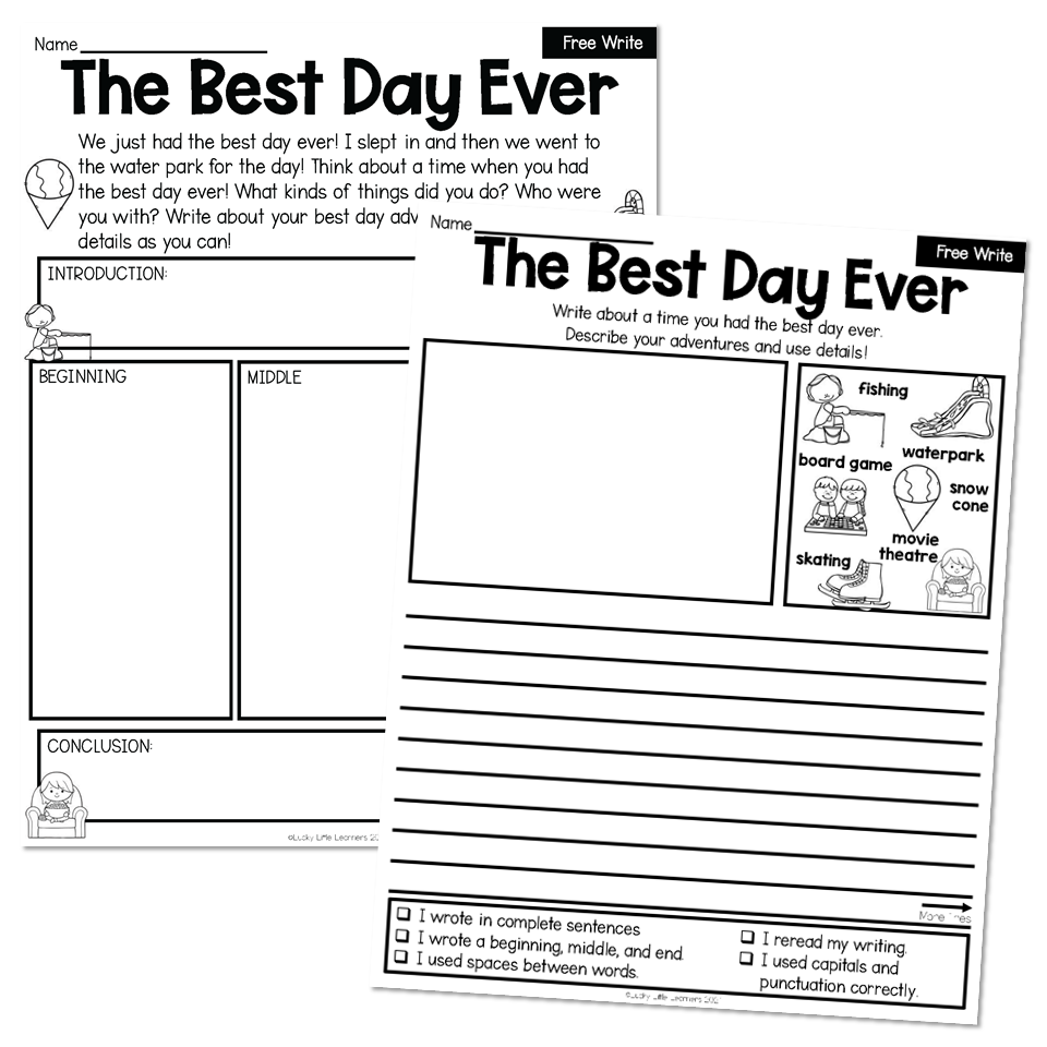 A 2nd grade no prep free write page about the best day that includes a graphic organizer, handwriting paper, a word list, and an editing checklist.