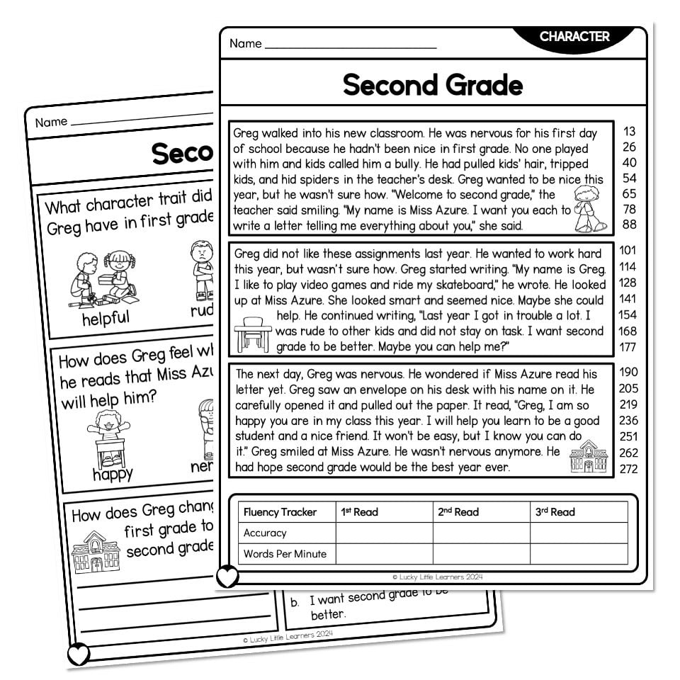A 2nd grade reading comprehension passage titled, “Second Grade”, with a focus on character for students reading at grade level. It includes a word count, a fluency tracker, and comprehension questions.