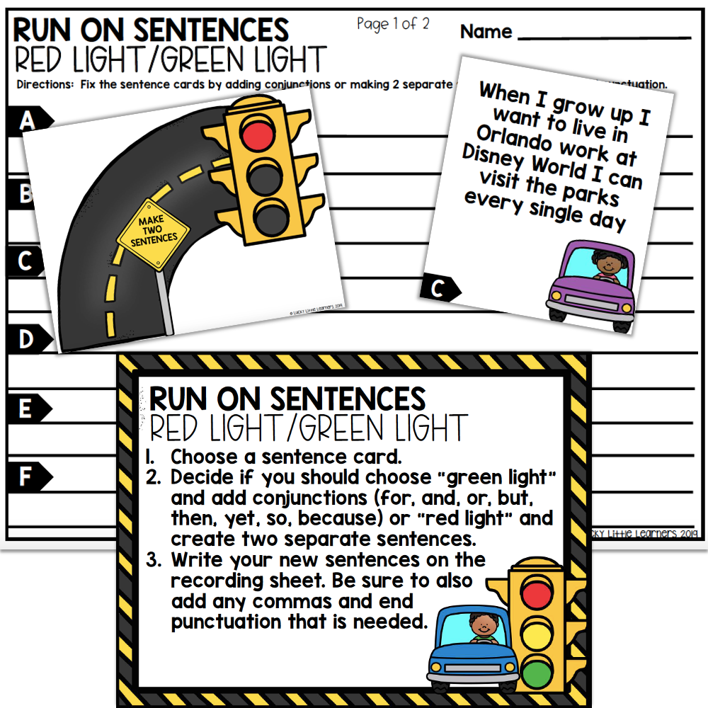 A 2nd grade run-on sentences grammar center that practices editing run on sentences by either adding a conjunction or creating two separate sentences.