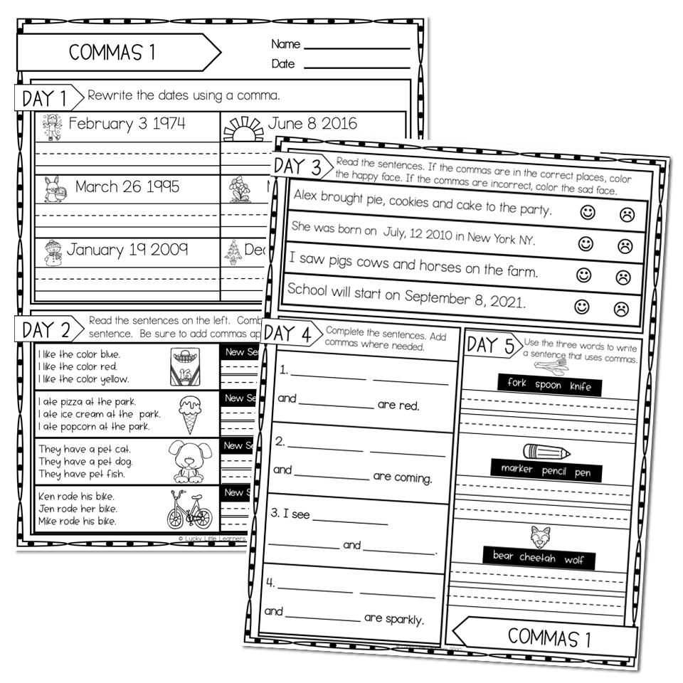 A 2nd grade grammar worksheet with 5 days of comma practice that can be used as a writing center, small group, and homework.