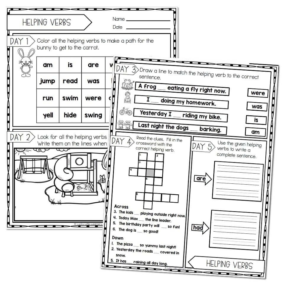 A 2nd grade grammar worksheet with 5 days of spiral practice of helping verbs that can be used as a writing center, small group, and homework.