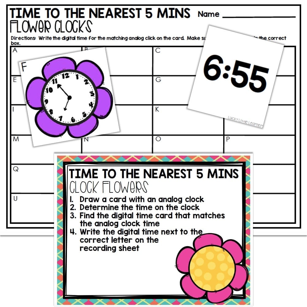 A 2nd grade telling time center in which students will match digital and analog time cards to the nearest 5 minutes.