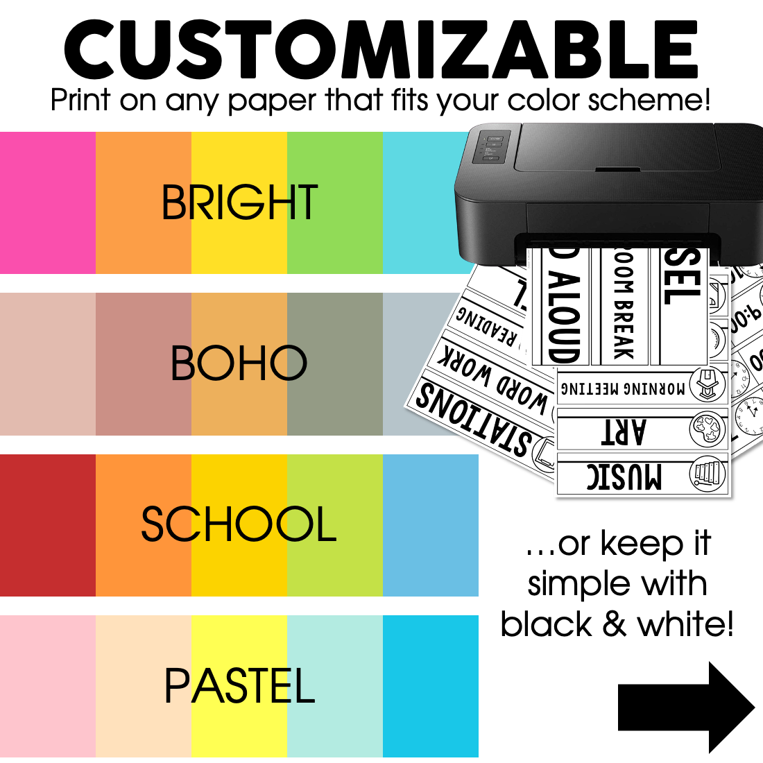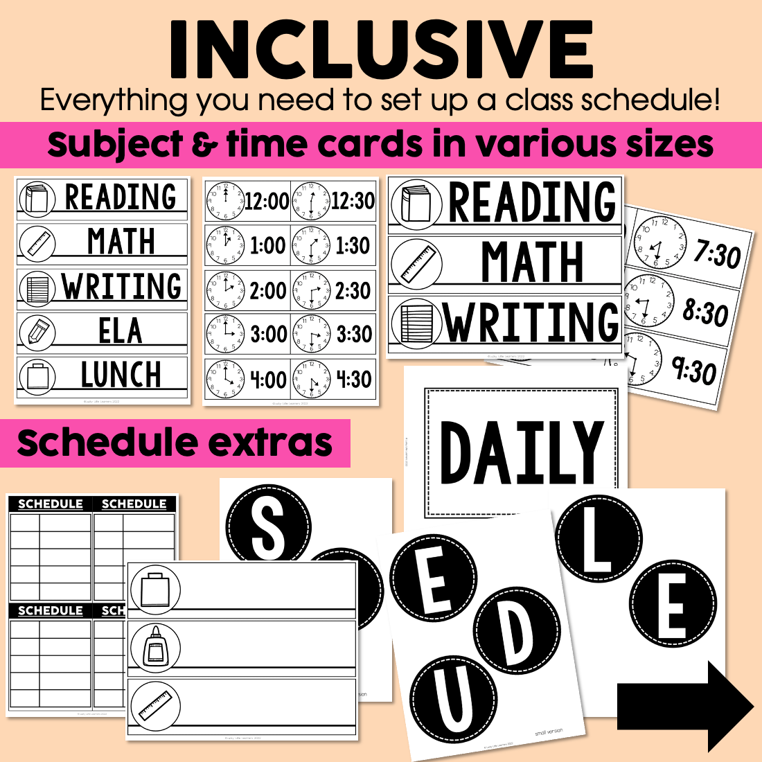 There are different sizes of schedule & time cards included. Every card is editable so you can get the wording perfect for your students!