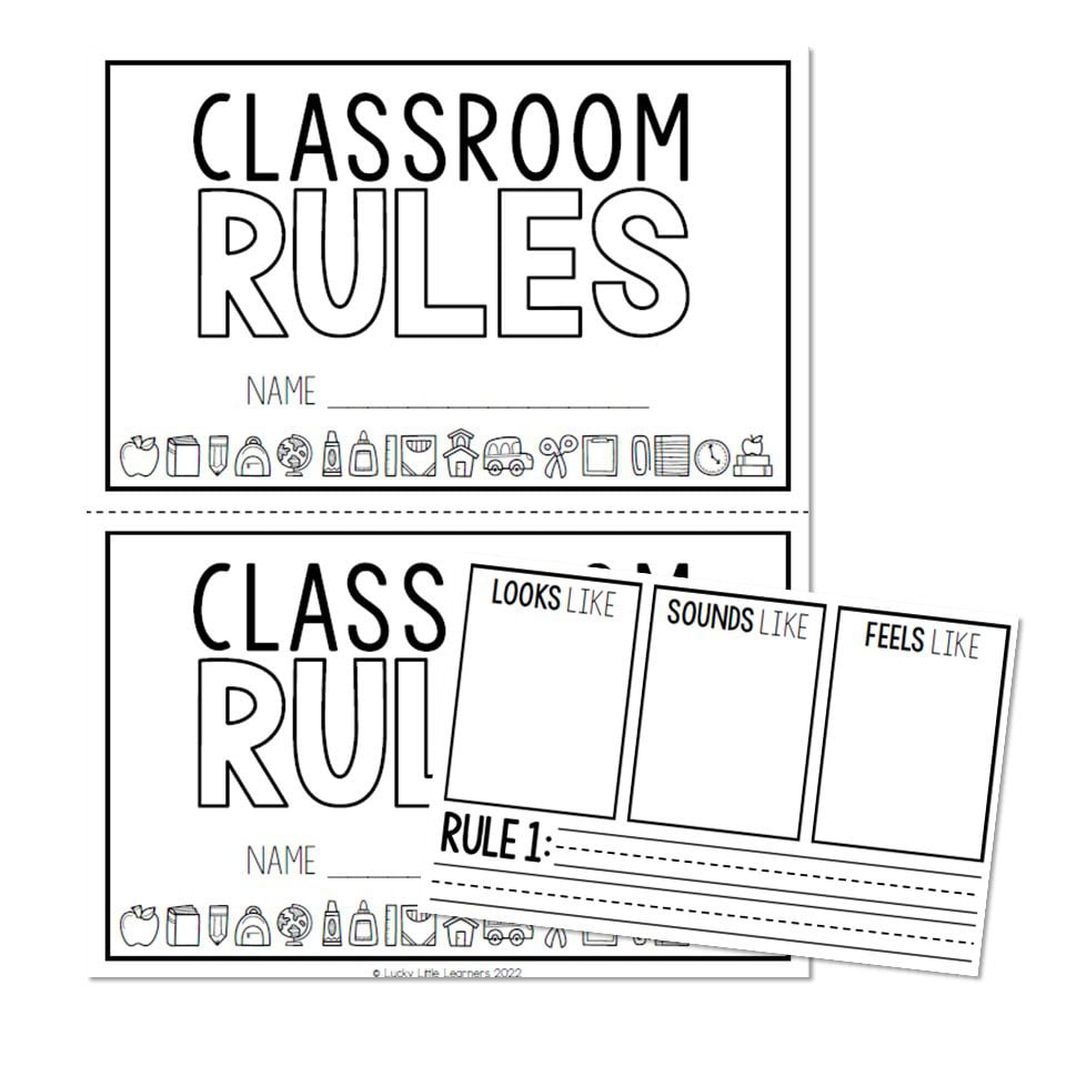 A classroom rules booklet. Students will write each rule and draw/write what each rule looks like, sounds like and feels like. There are two layout options.