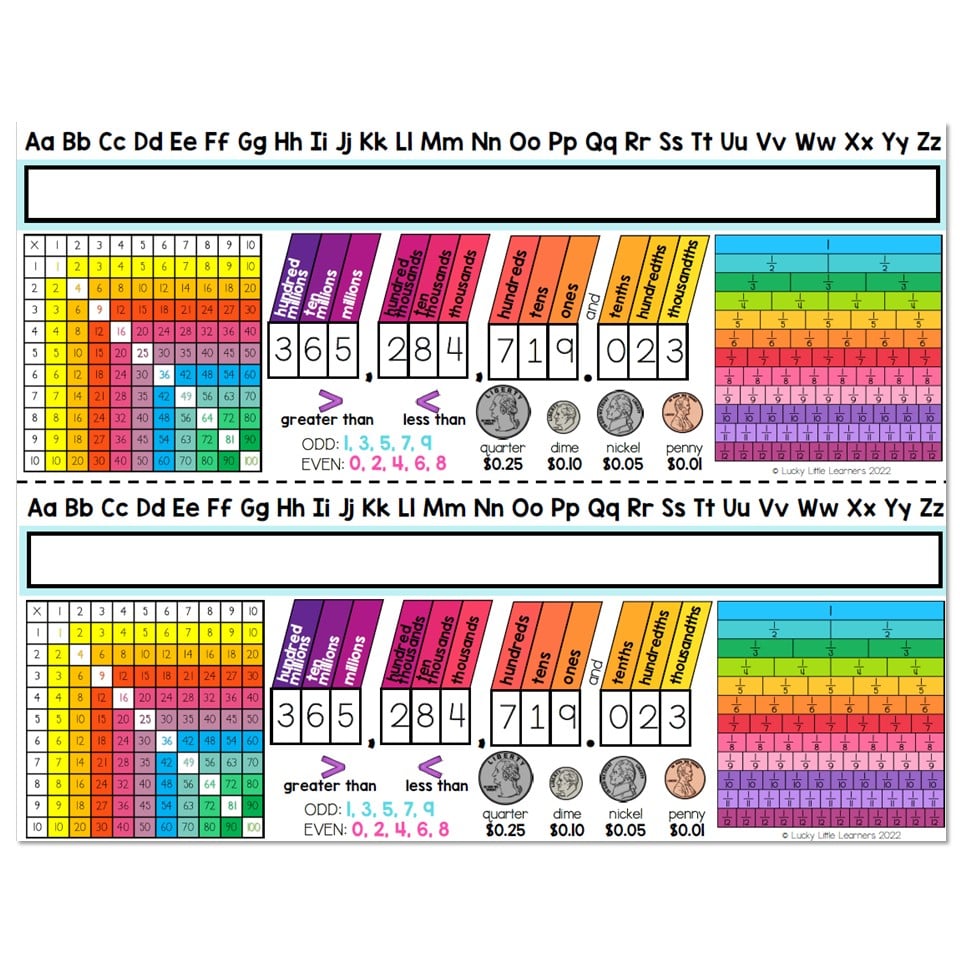 A student desk plate including a place for a student name, an alphabet, place value chart, multiplication chart, fraction blocks, greater than/less than, coins and odd & even.