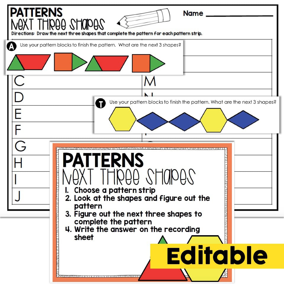 An editable version of the 2nd grade math center in which students practice extending patterns.