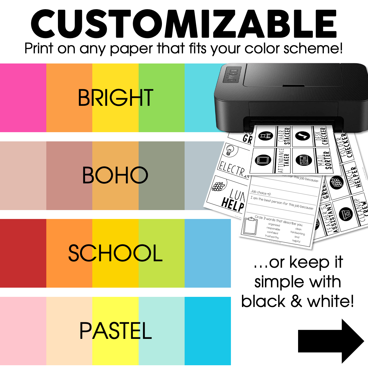 The job cards can be printed on any paper color(s) you wish! Brights, neutrals, pastels, etc.