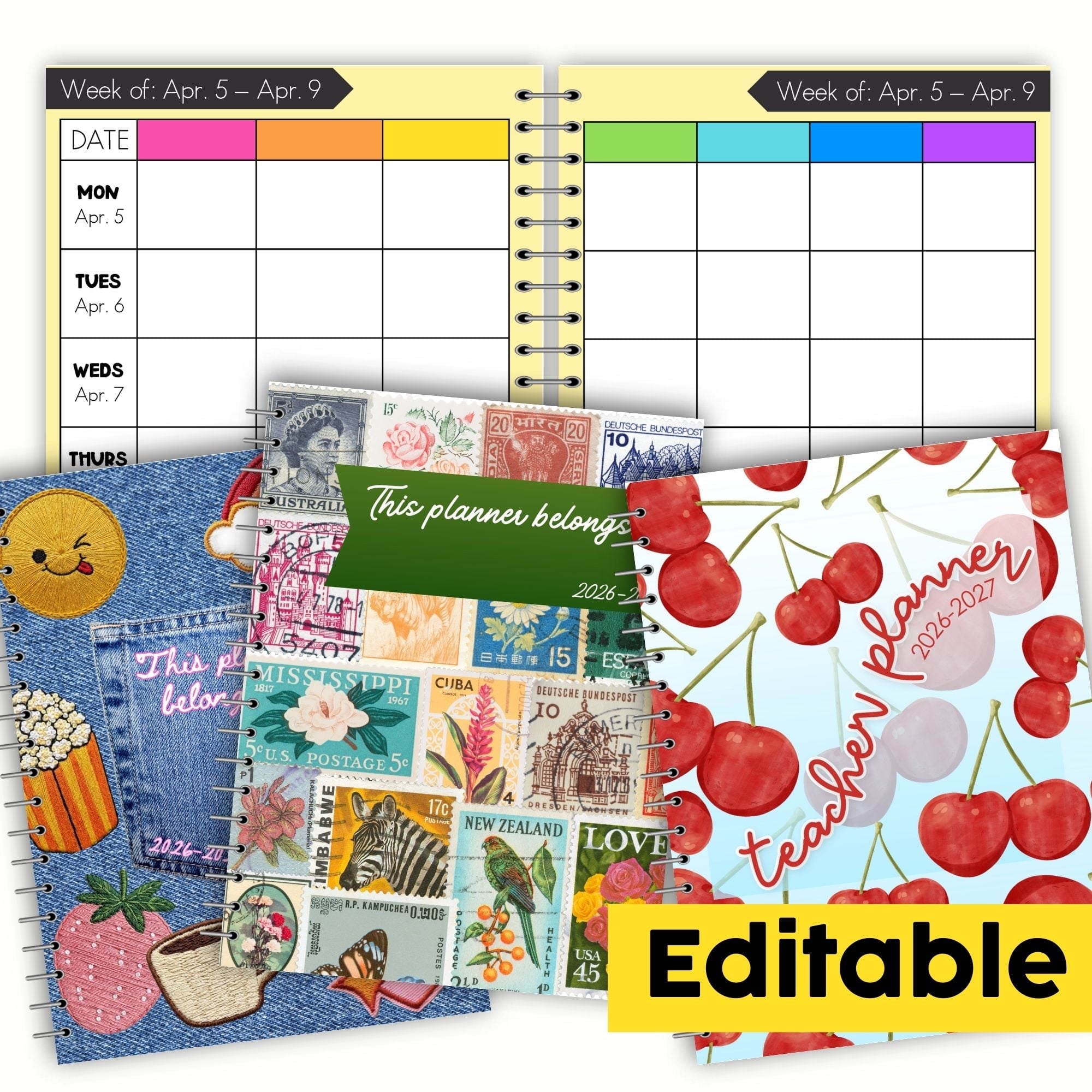 An editable 2026 – 2027 teacher planner with spots for 7 teaching blocks. (Eight different cover options!)