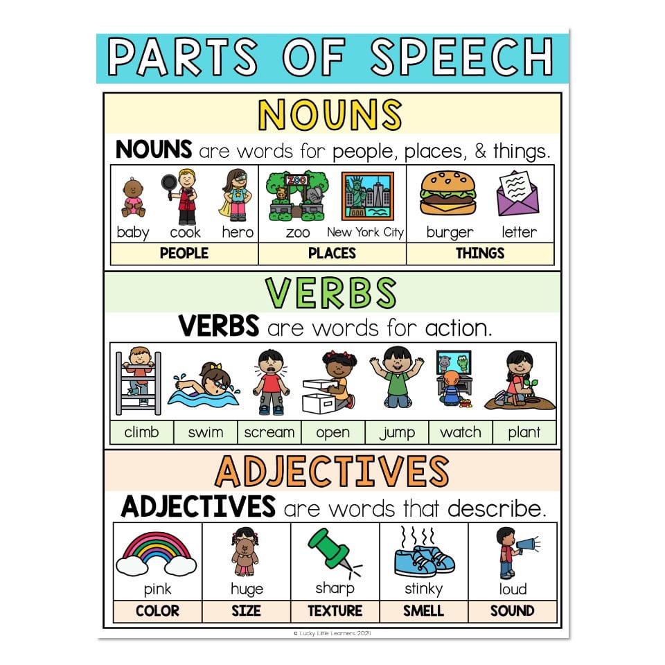 A grammar anchor chart focusing on nouns, verbs and adjectives.