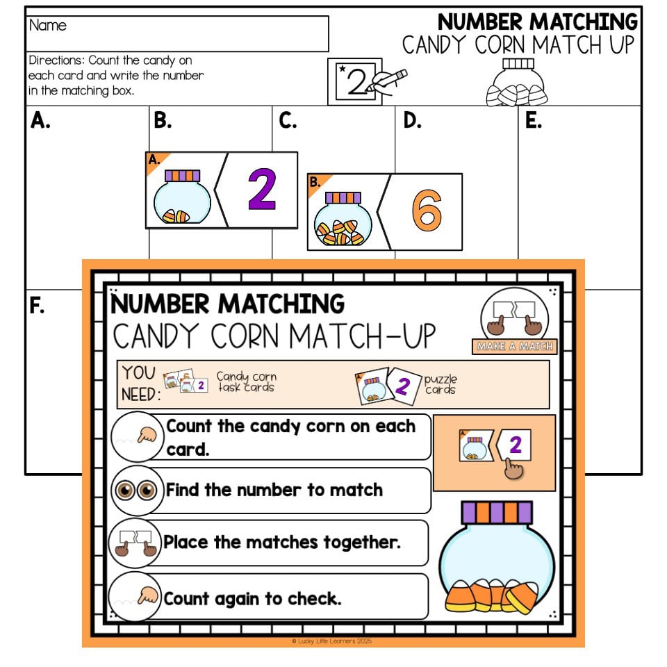 A candy corn themed Kindergarten math center in which students will practice matching numbers.