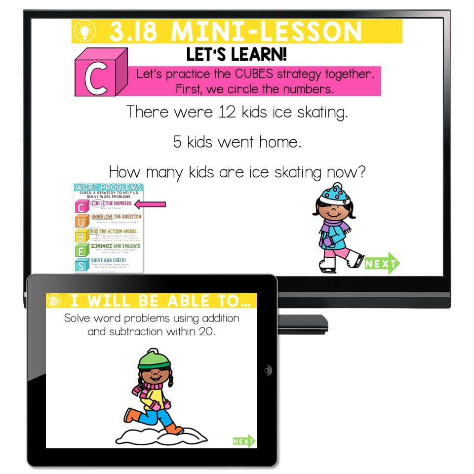 A digital slides math lesson focusing on solving word problems using addition and subtraction within 20.