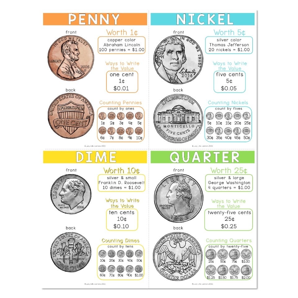 An anchor chart focused on coin values. This download includes a color version, black and white version, and open-ended template.