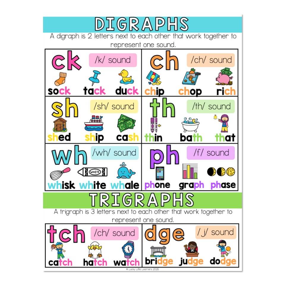 A phonics anchor chart to use when working on digraphs and trigraphs.