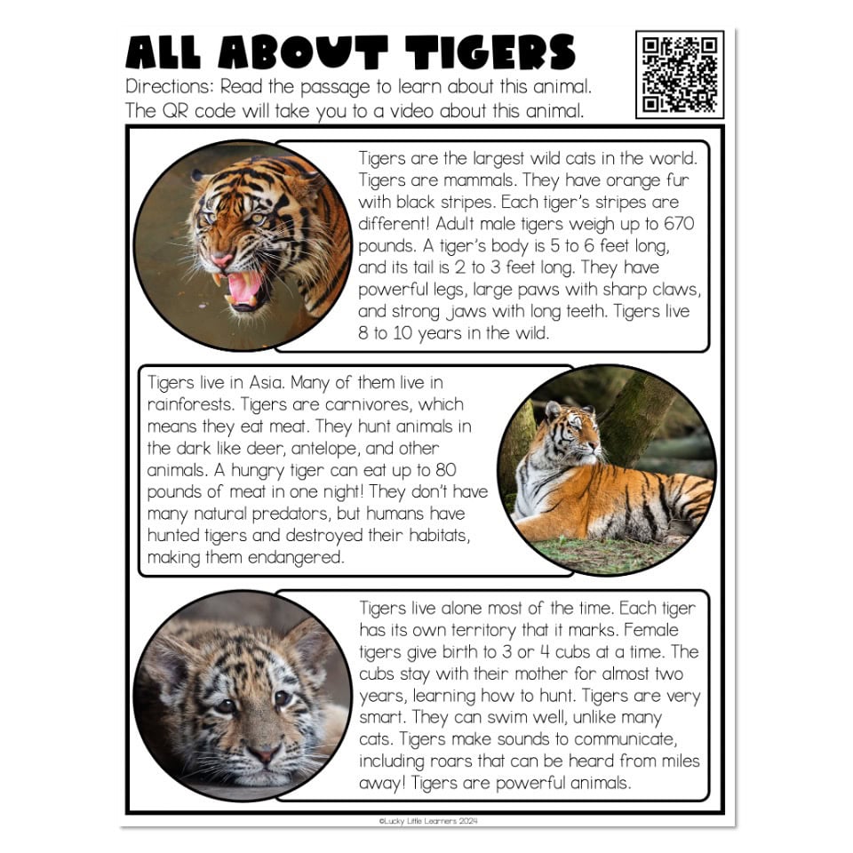 An informational passage about tigers, including a QR video, that students can use when researching for their animal repots.