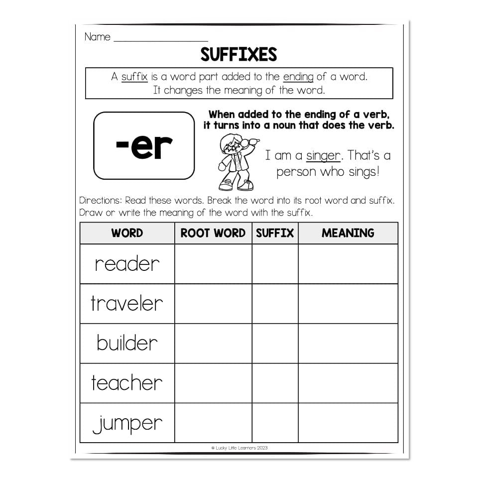 A practice sheet on which students identify root words with the suffix -ER, as well as define the new word made when adding the suffix.