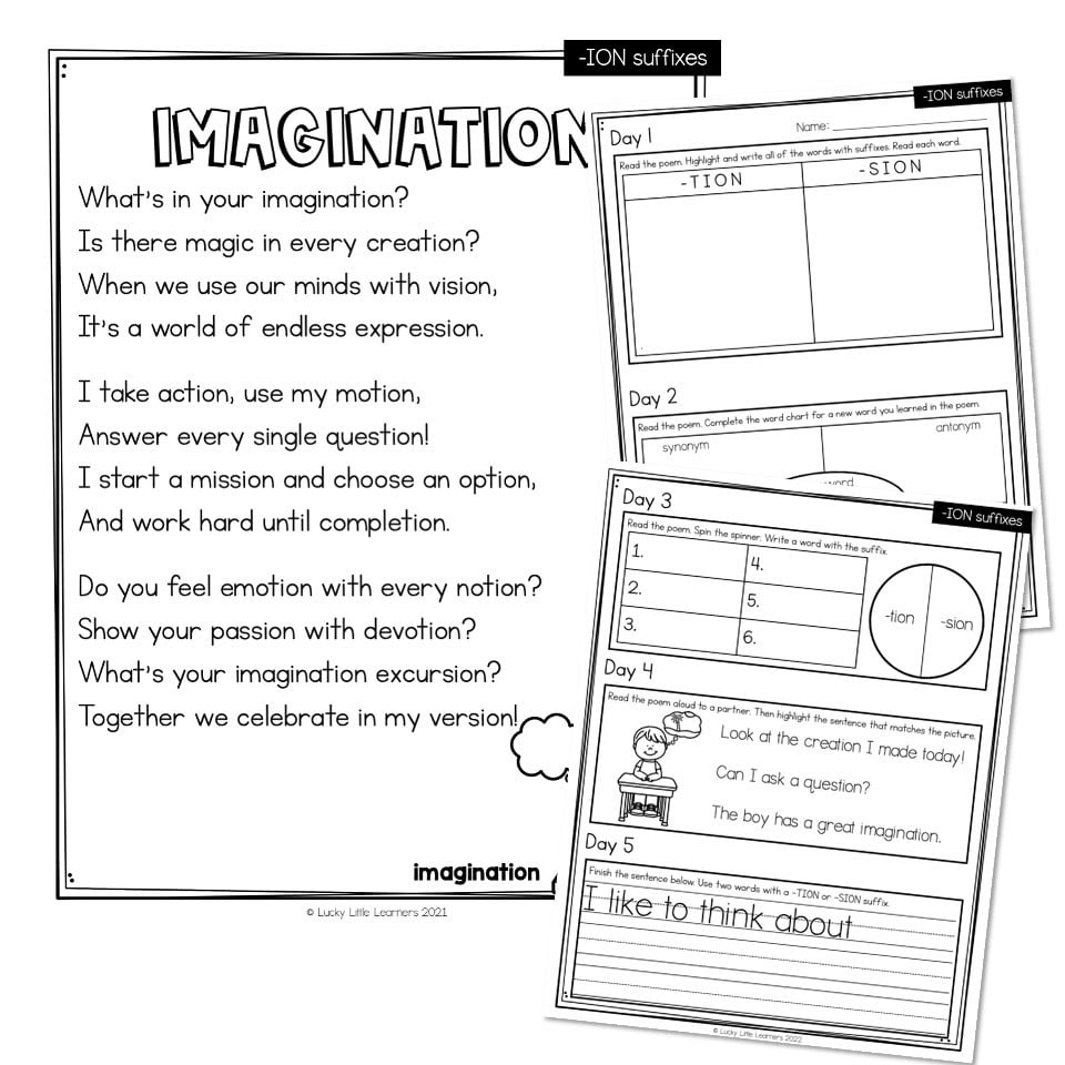 This phonics poem gives students the opportunity for students to apply their knowledge of the -ION suffix to text. This poem provides 5 days of reading fluency activities.
