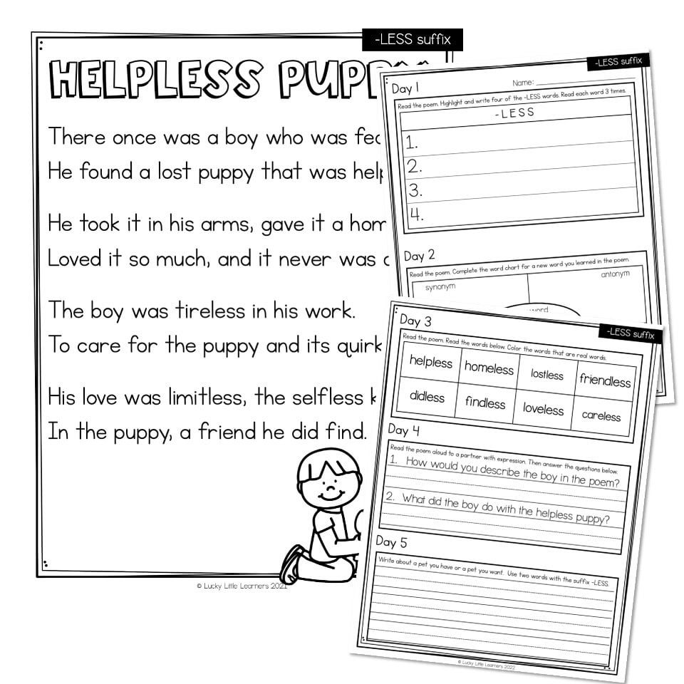 This phonics poem gives students the opportunity for students to apply their knowledge of the -LESS suffix to text. This poem provides 5 days of reading fluency activities.