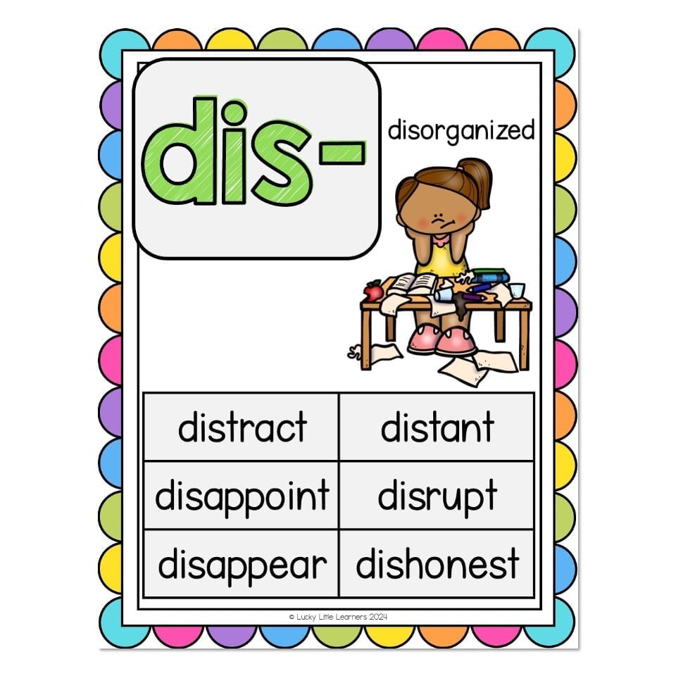 A poster that features words with the prefix DIS-. It can be used as a whole group focus poster, on a bulletin board, in a writing station, and in a small group setting during a lesson.