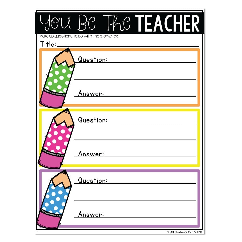 A reading comprehension activity in which students will get to be the teacher, writing comprehension questions (and answers), for a story.
