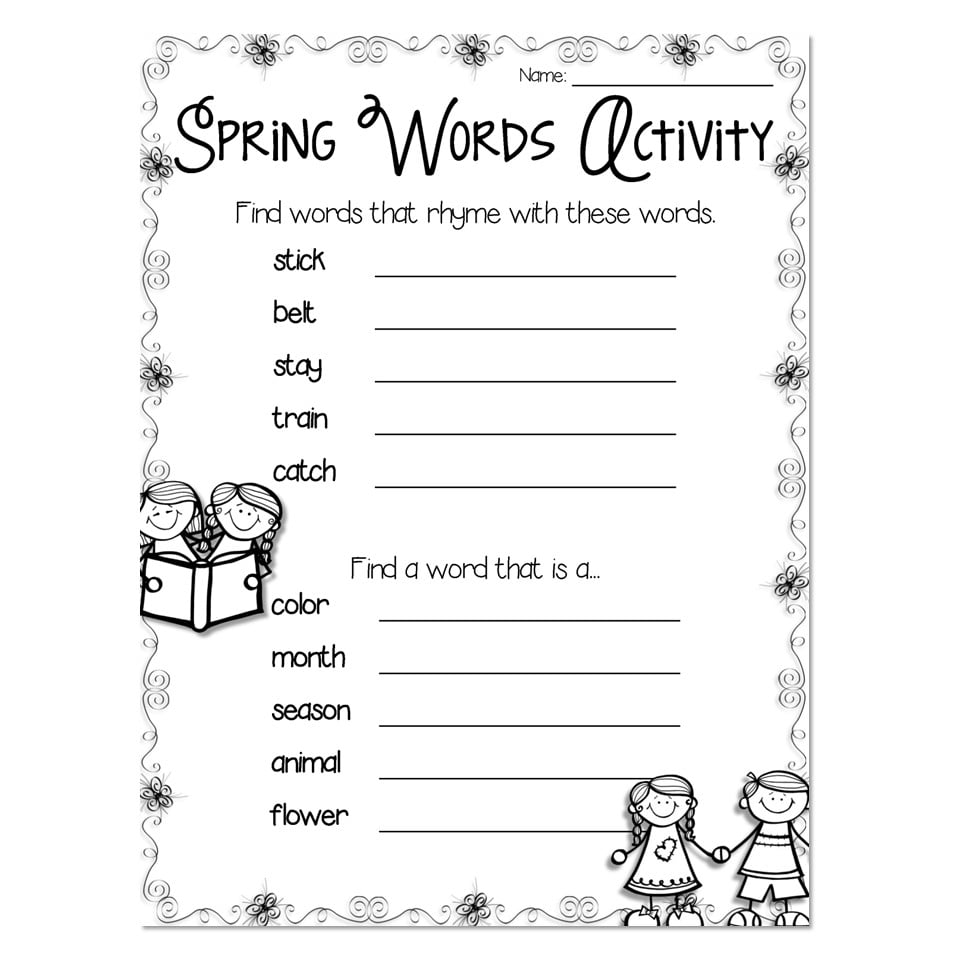 A spring-themed activity sheet where students will work on rhymes as well as go on a word wall hunt.